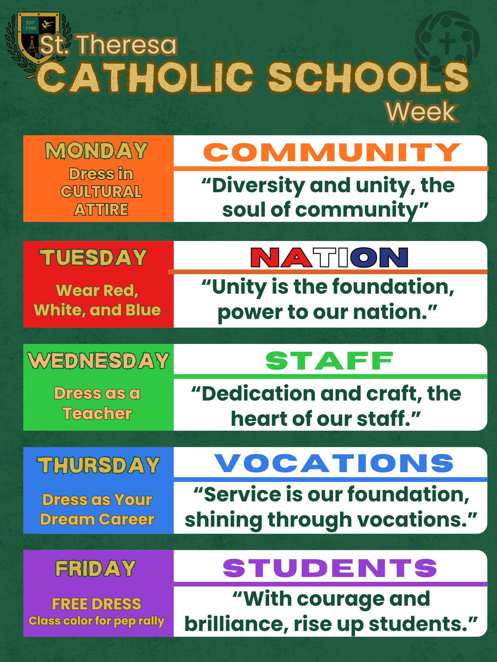 Throughout the week, our students, faculty, and families will come together in faith, learning, service, and school spirit. From prayer and liturgy to special activities and themed days, Catholic Schools Week highlights what makes our school unique: a commitment to academic excellence rooted in Gospel values.